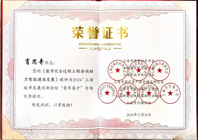 上海建科工程咨詢有限公司數字化主管肖思奇博士作為上海市建設工程咨詢行業協會推薦的專家,在本次論壇“青年英才”專場作主題報告,并獲頒“青年英才”專場優秀論文榮譽證書。